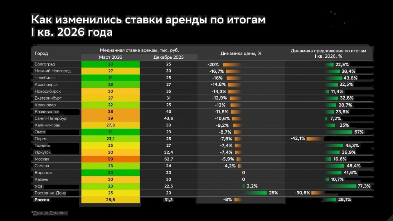 Аналитики Домклик рассмотрели данные витрины Домклик по долгосрочной аренде в крупных городах России в марте 2026 года и декабре 2025 года. В выборке участвовали квартиры и студии эконом— и комфорт-сегмента площадью от 20 до 40 кв. м.